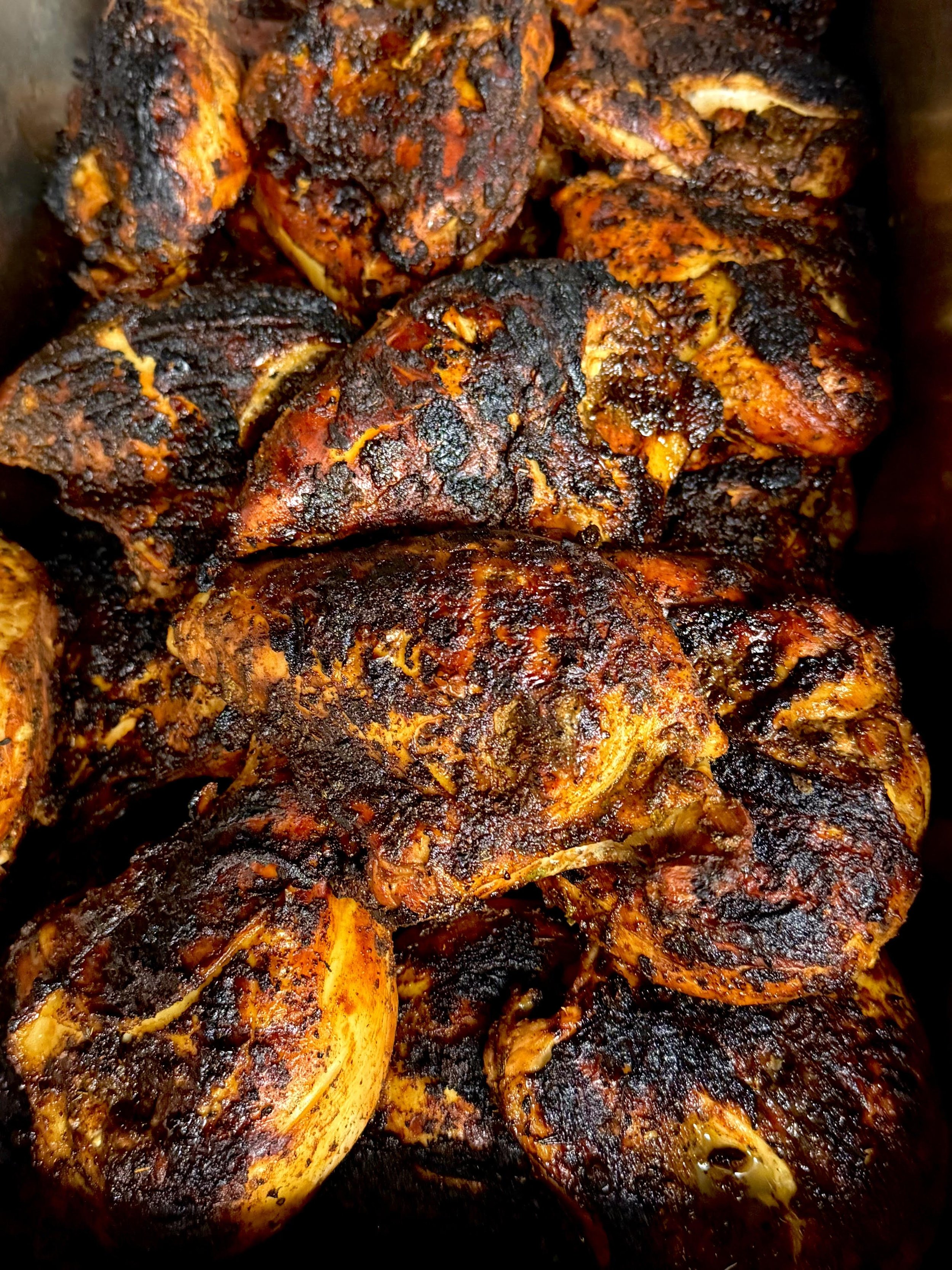 Our chicken is 24 hour marinated in citrus and secret spices, then dry brined before being cooked skin on over a charcoal grill and then roasted.